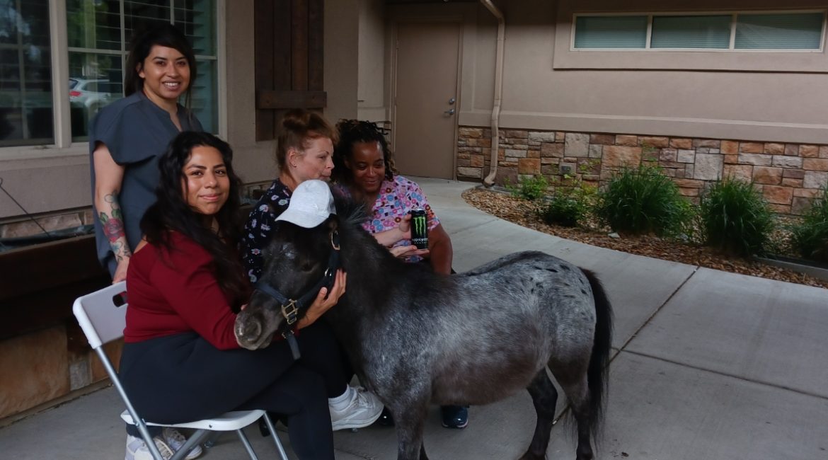 During our visit to Rocky Mountain Assisted Living, the atmosphere was filled with joy and warmth, thanks to a very special guest—Squiggy, the miniature horse. With his gentle eyes and unmistakable smile, Squiggy brought an infectious energy that lifted everyone’s spirits. Residents gathered outside to meet him, and the excitement was evident in every face. His calm demeanor and friendly nature made him an instant favorite.
